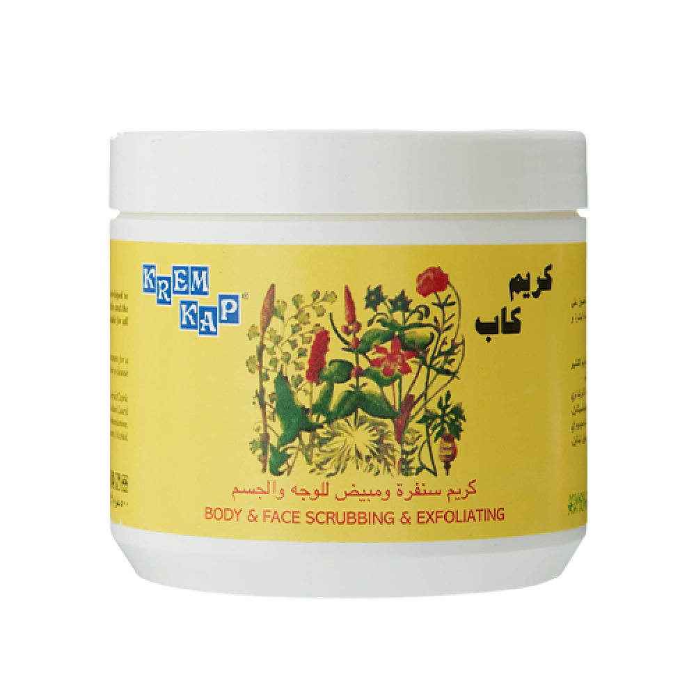 الخطوة الاولى : استخدمي كريم كاب مع ملح الحليب على كامل الجسم مع التقشير بشكل لطيف قبل الاستحمام واتركيها لمدة 15 دقيقة