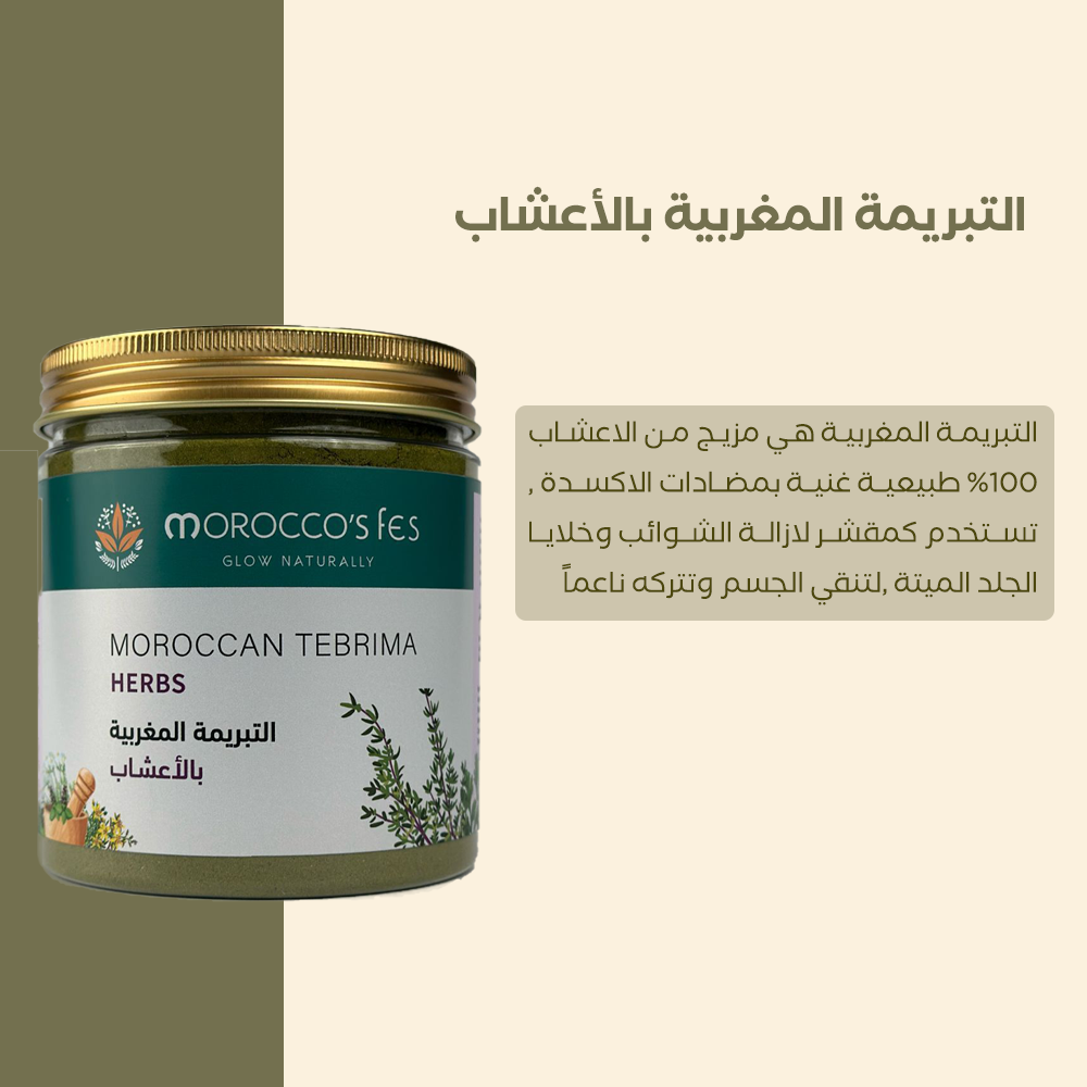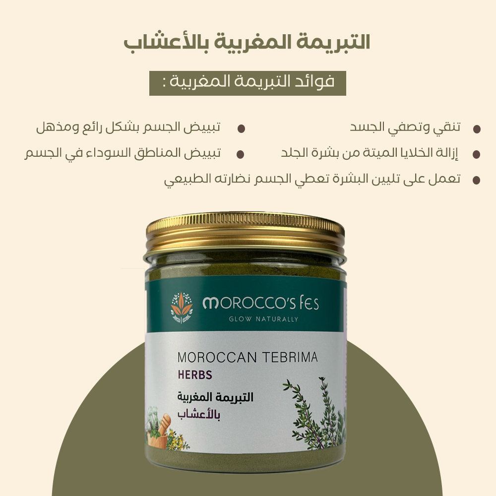 التبريمة المغربية هي مزيج من الاعشاب %100 طبيعية غنية بمضادات الاكسدة , تستخدم كمقشر لازالة الشوائب وخلايا الجلد الميتة ,لتنقي الجسم وتتركه ناعماً .
