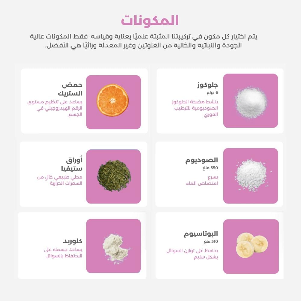 - يعيد توازن الإلكترولايتات والأملاح المعدنية بسرعة وفعالية.