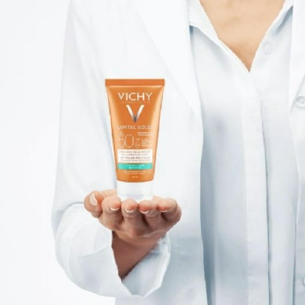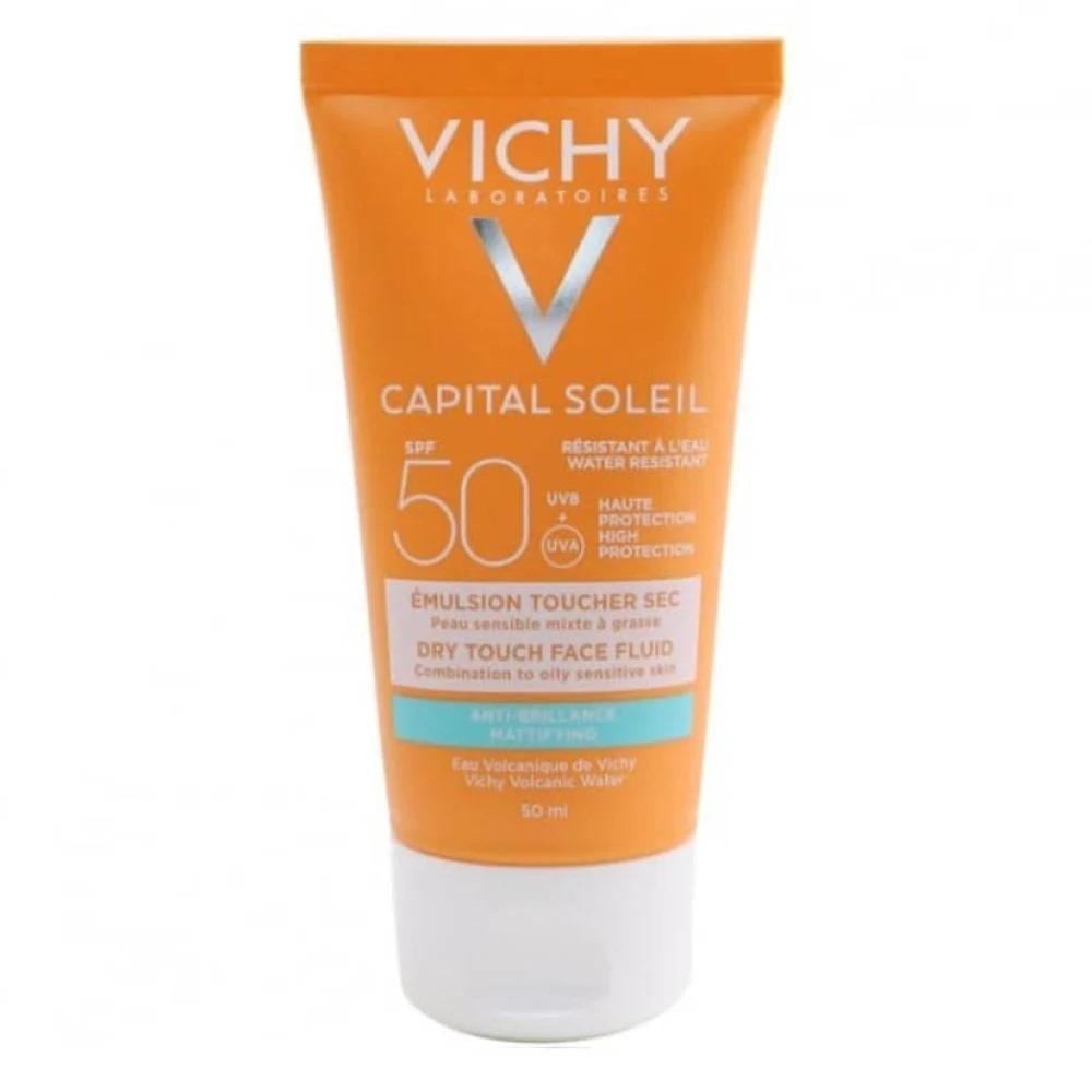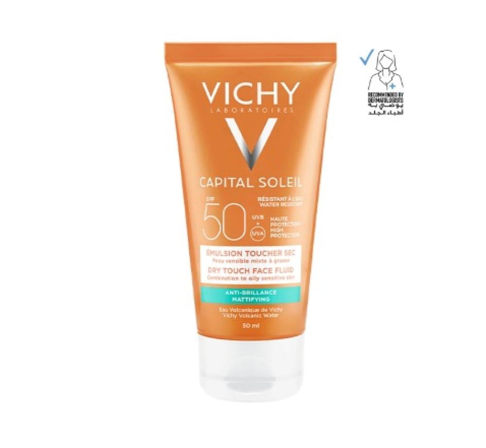 كريم واقي الشمس من فيشي كابيتال سوليل SPF50 يحمي البشرة من أشعة UVA/UVB، بتركيبة خفيفة غير دهنية تمتص بسرعة، مناسب للبشرة المختلطة والحساسة.