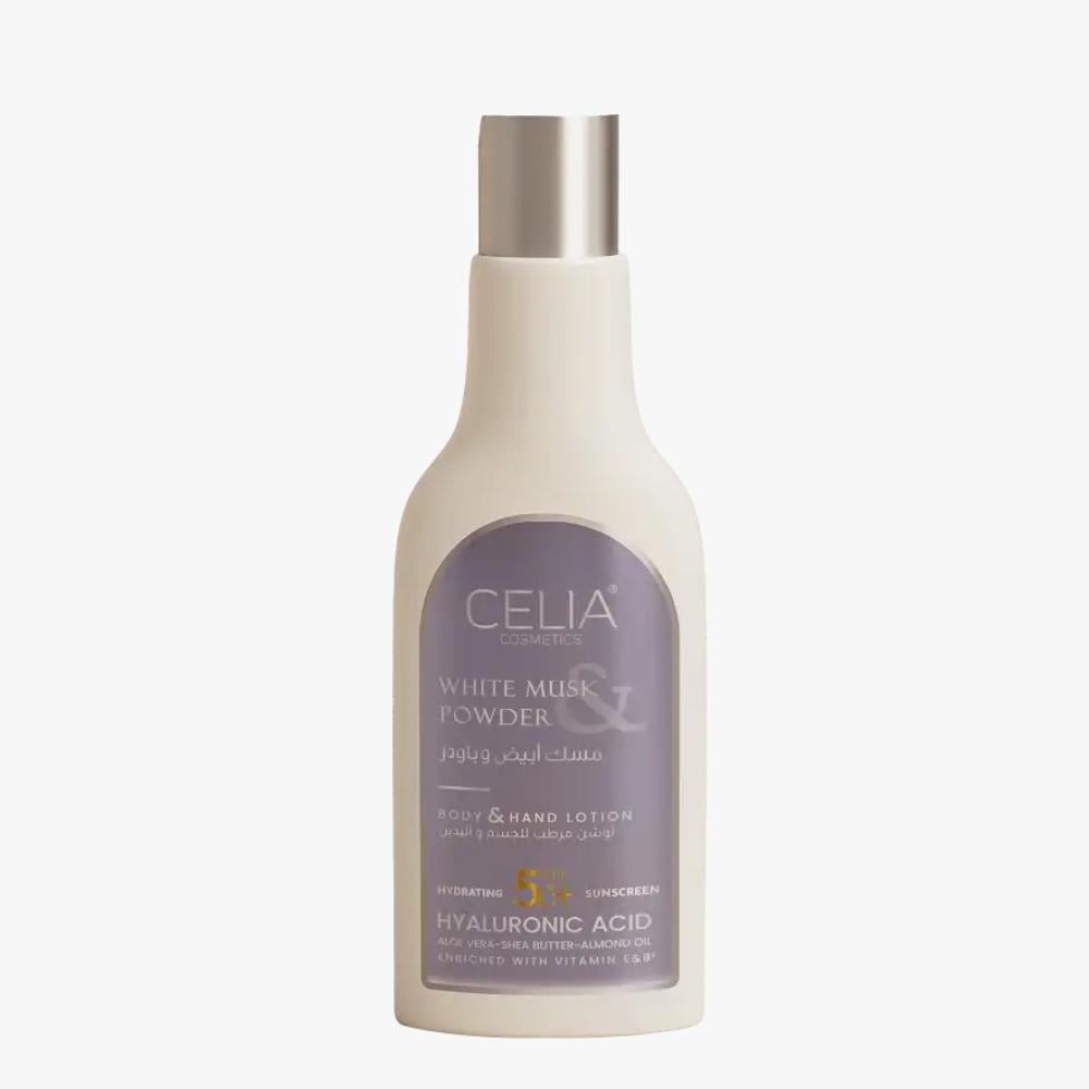 Musk and powder lotion that moisturizes and protects from the sun with SPF 50 from Celia